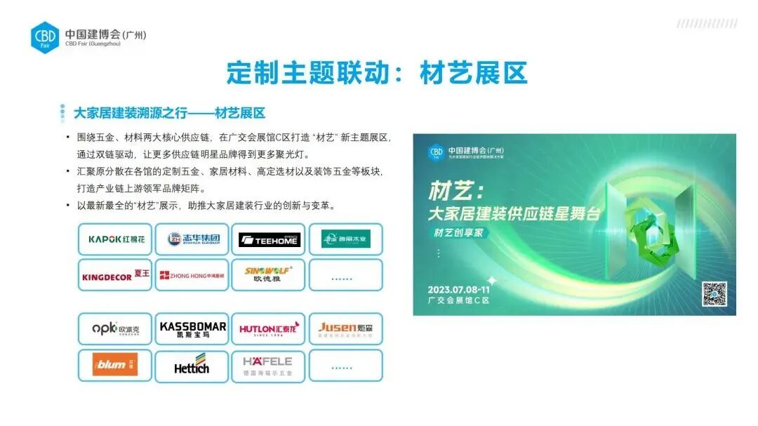 材料和工艺是行业创新的源泉。中国建博会(广州)顺应行业创新需求,突破以往对材料、五金等供应链题材的分散布局,新设立以“材料”和“工艺”为展示核心要素的“材艺”主题展区,强化上游材料、五金企业与下游定制家居、成品企业之间的交流互动,系统地汇聚和展示大家居建装行业完整供应链、生态链。