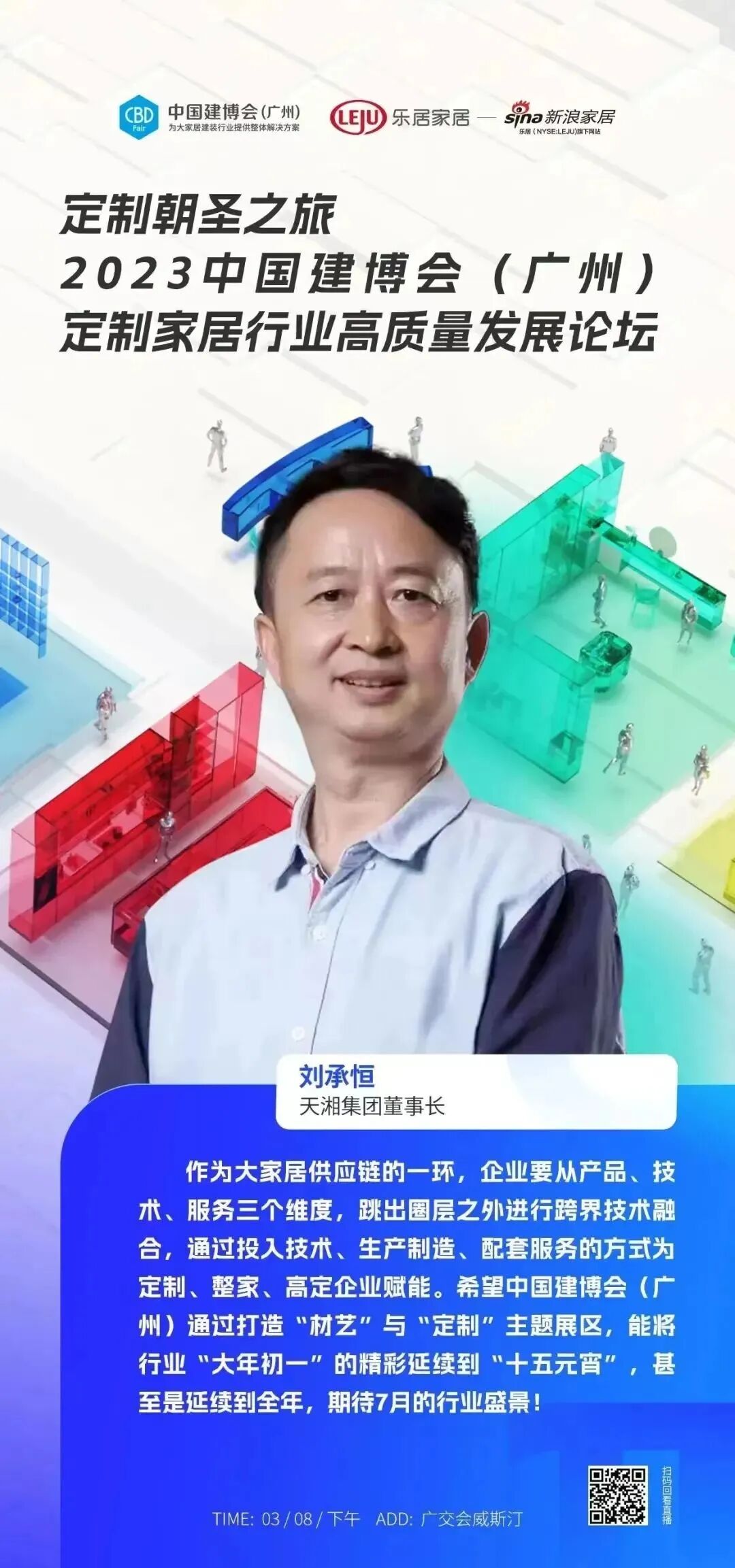 3月8日,中国建博会(广州)联合新浪家居,在广交会威斯汀酒店隆重举办“【定制朝圣之旅】2023中国建博会(广州)定制家居行业高质量发展论坛”,并举办了2023中国建博会(广州)“定制朝圣之旅”启动仪式。论坛汇聚了众多定制家居企业领袖,深度探讨行业在新阶段如何协同多元渠道力量,推动定制家居行业高质量发展,天湘集团董事长刘承恒受邀参与盛会。