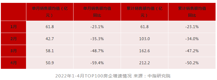 另外,今年前4个月,百强房企销售额均值同比大幅下降50.2%,销售额超千亿房企仅3家,较2021年同期减少了6家。