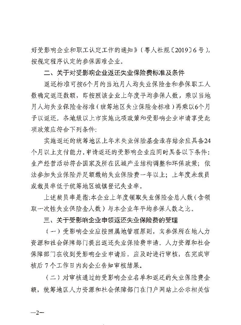 为贯彻落实《广东省人民政府关于印发广东省进一步促进就业若干政策措施的通知》(粤府〔2018〕114号)精神,现就做好2019年受影响企业失业保险费返还工作有关问题明确如下: