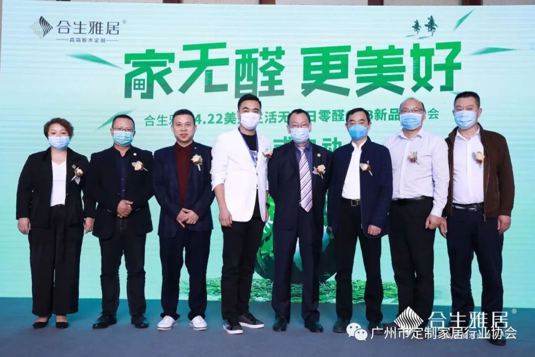 合生雅居董事长龙红、合生雅居CEO王天兵、广东省定制家居协会秘书长曾勇、广东省家具协会副会长兼秘书长张承志、广州市设计产业协会常务副会长/秘书长欧伍祥、中国五金制品协会家居五金专委会秘书长薛蓉、定峰汇创始人杨峰、家居荟创始人王文国在全场嘉宾及观众、在线的全国经销商和消费者的瞩目下一起启动合生雅居“美好生活无醛日”