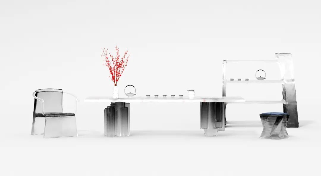 “墨寒”灵感源自中国文化的深化,有着才高八斗、一尘不染之意,更有着嫦娥、广寒、月宫等中国久远的传说故事的寓意,也是中国传统独有的美学气质来源。水晶的晶莹材质与月色的光辉相互交映,构成了新奇的视觉美感。在配色上,摒弃了固有的单色,而是将水墨山水之色融入其中,墨色的朦胧中和了水晶锋芒,根据传统的哲学意味。形态上一改现有产品的流动状态,转而以几何块状来诠释冰川的雄奇,与水墨的渐变形成对比。椅子的设计则与桌子的面块形成对比,将冰川的另一面:水的流动感表露无疑。整套茶家具体现了一种阴阳和合的理念。