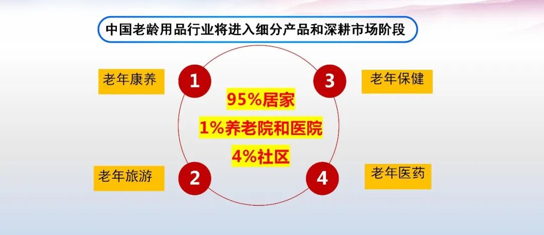 随着居民收入水平不断提高,国家老龄产业战略和政策的全面实施,按照95%居家、4%社区、1%养老院和医院的养老比例,大健康产业必将促进老年康养、老年旅游、老年保健、老年医药等市场的快速发展,市场容量将会进一步提升,中国老龄用品行业将进入细分产品、深耕市场阶段。