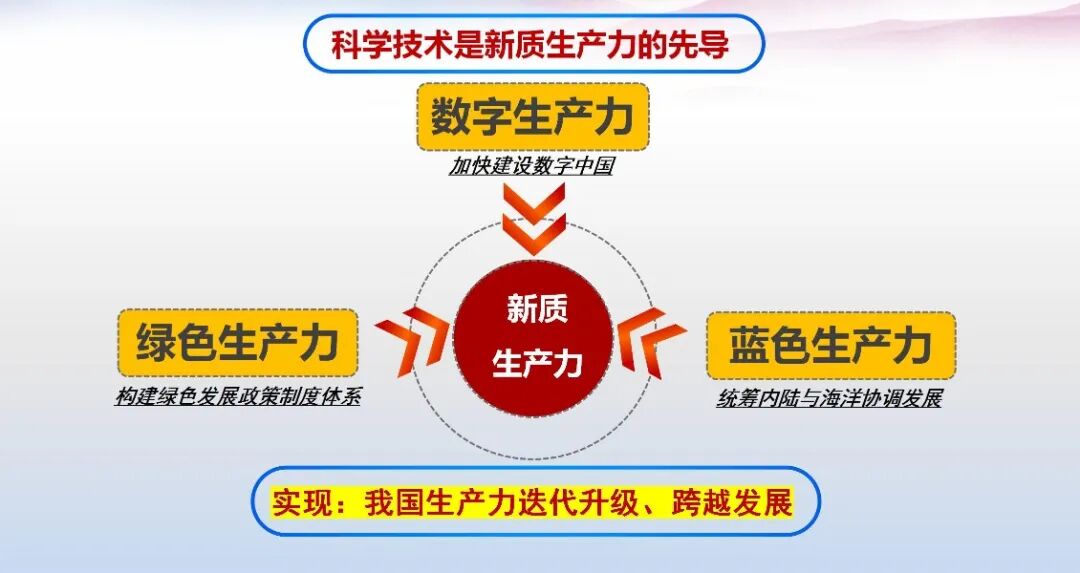 从我国经济发展实际看,新质生产力表现形式有“三力”:以数字技术为基础产生的数字生产力;在绿色低碳理念和新能源技术影响下产生的绿色生产力;还有依托海洋科技、不断走向深蓝、实现海陆循环而形成的蓝色生产力。