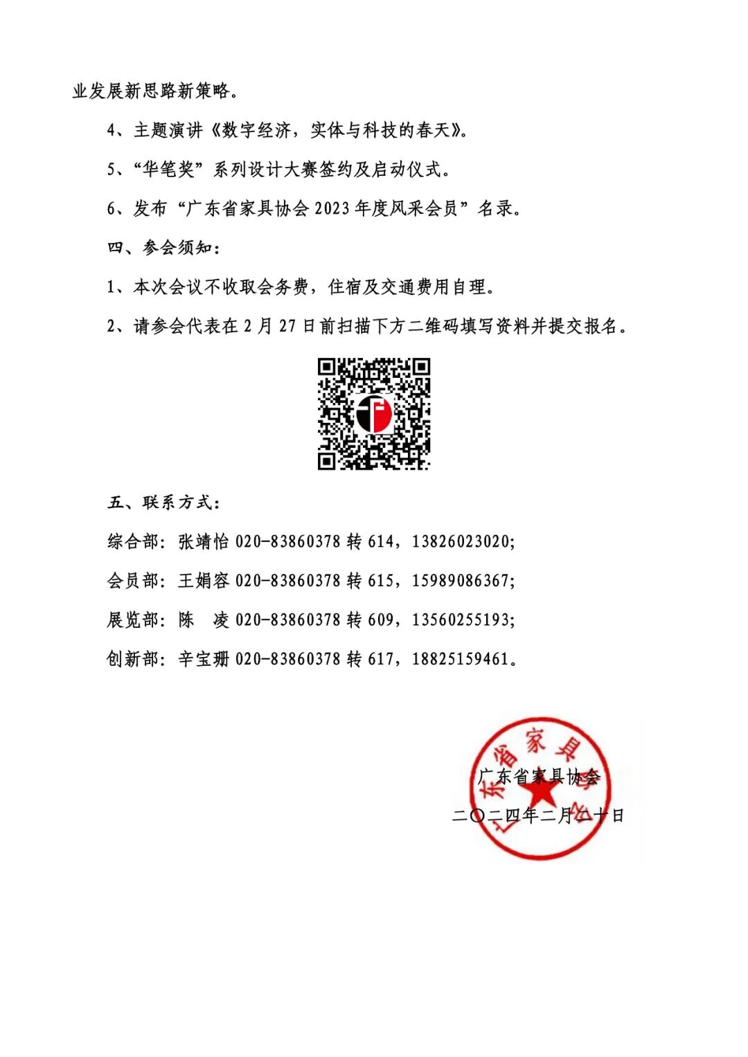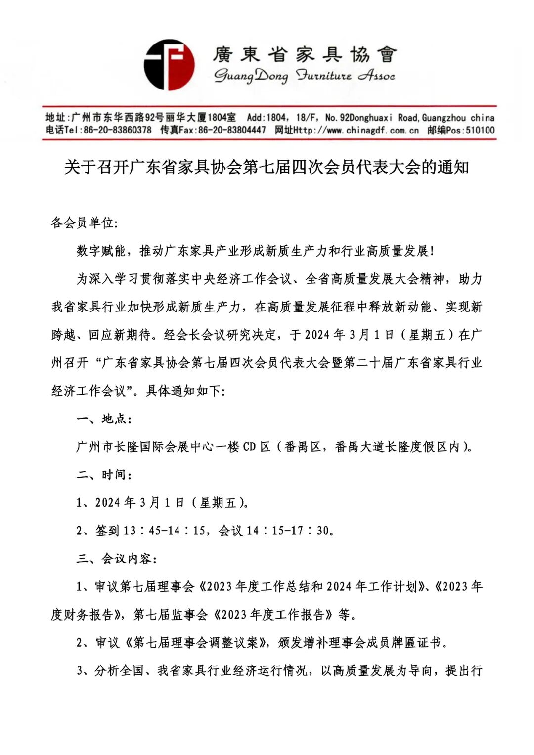 为深入学习贯彻落实中央经济工作会议、全省高质量发展大会精神,助力我省家具行业加快形成新质生产力,在高质量发展征程中释放新动能、实现新跨越、回应新期待。经会长会议研究决定,于2024年3月1日(星期五)在广州召开“广东省家具协会第七届四次会员代表大会暨第二十届广东省家具行业经济工作会议”。具体通知如下: