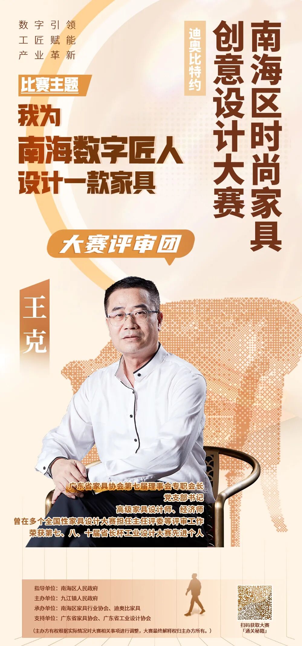 王克,广东省家具协会第七届理事会专职会长、党支部书记、高级家具设计师、经济师;曾在多个全国性家具设计大赛担任主任评委等评审工作,荣获第七、八、十届省长杯工业设计大赛先进个人。