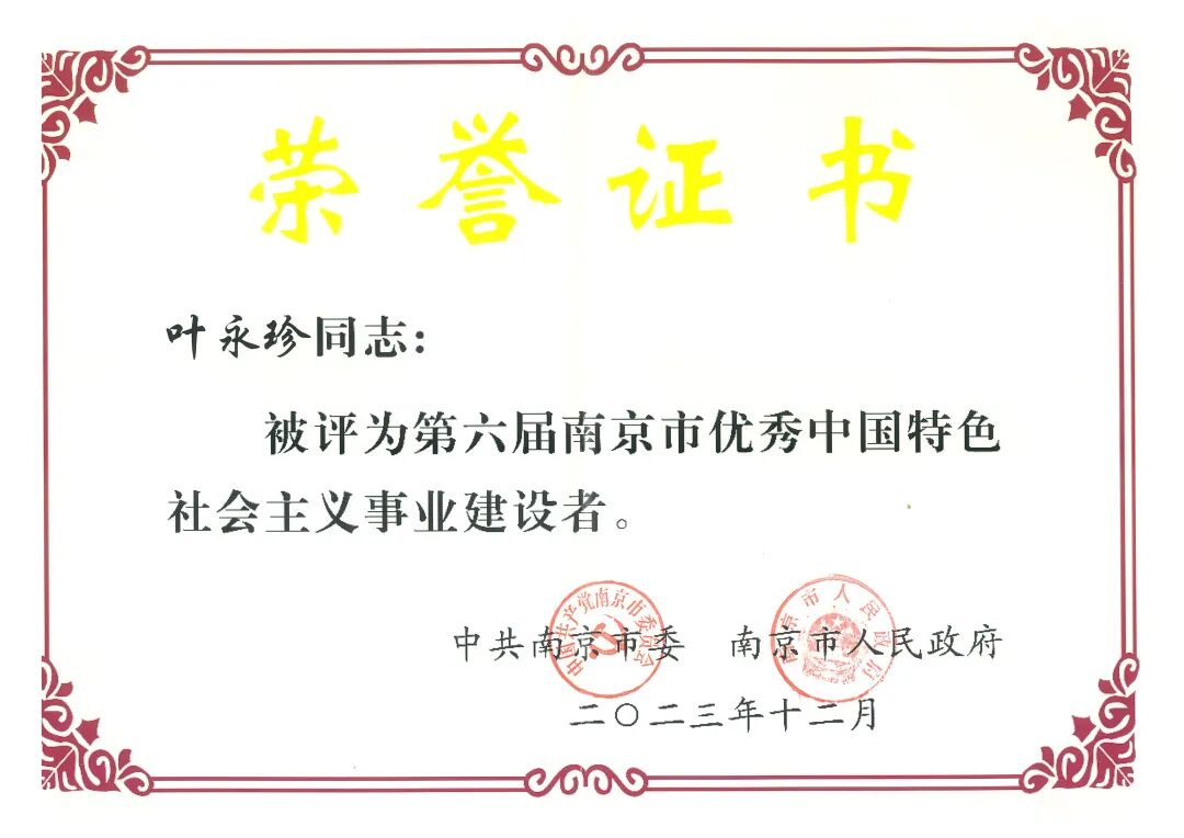 【会长风采】 海太欧林集团董事长叶永珍荣获“第六届南京市优秀中国特色社会主义事业建设者”称号