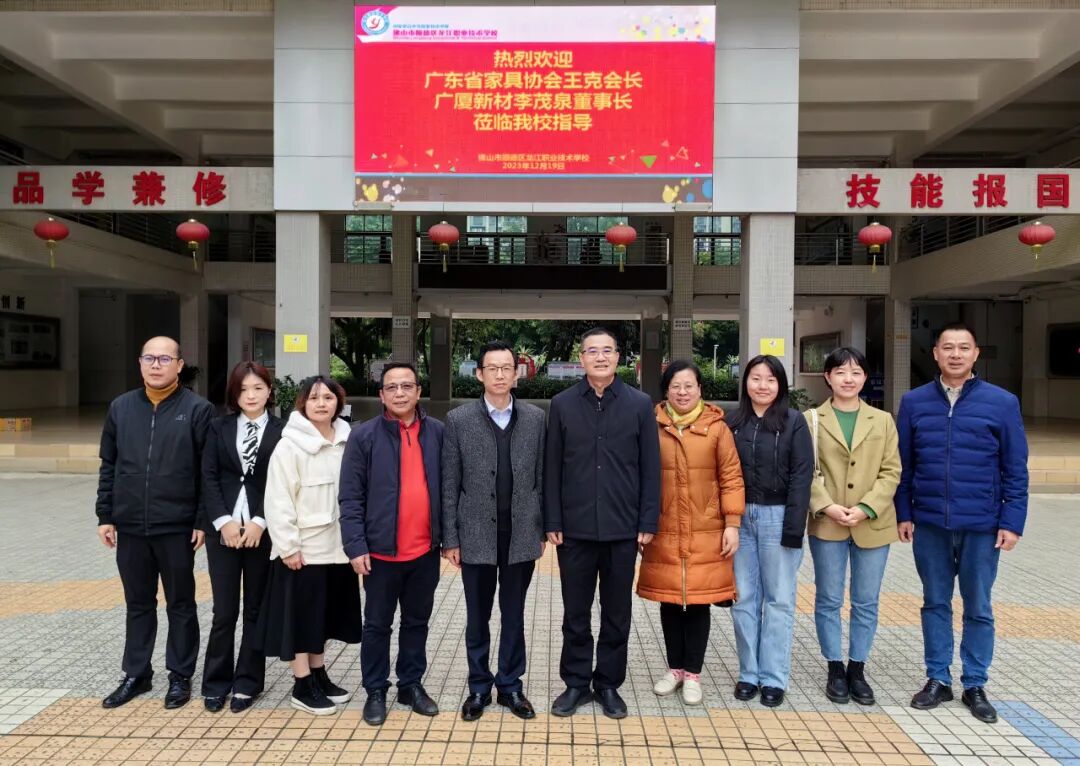 12月19日下午,广东省家具协会会长王克与协会理事单位广厦新材董事长李茂泉一行前往龙江职业技术学校,与学校校长陈义明、教学副校长杨慧、教务处主任邱旭波等就设计创新、校企合作、人才培养等方面开展调研并进行交流座谈。