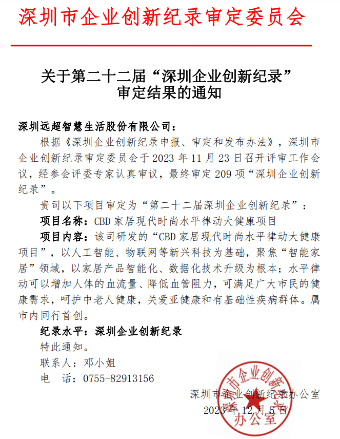 经深圳市企业创新纪录审定委员会全体委员认真审议,CBD律动健康项目被审定为第二十二届深圳企业创新纪录。彰显CBD律动健康在研发创新方面的卓越成就、巨大潜力。