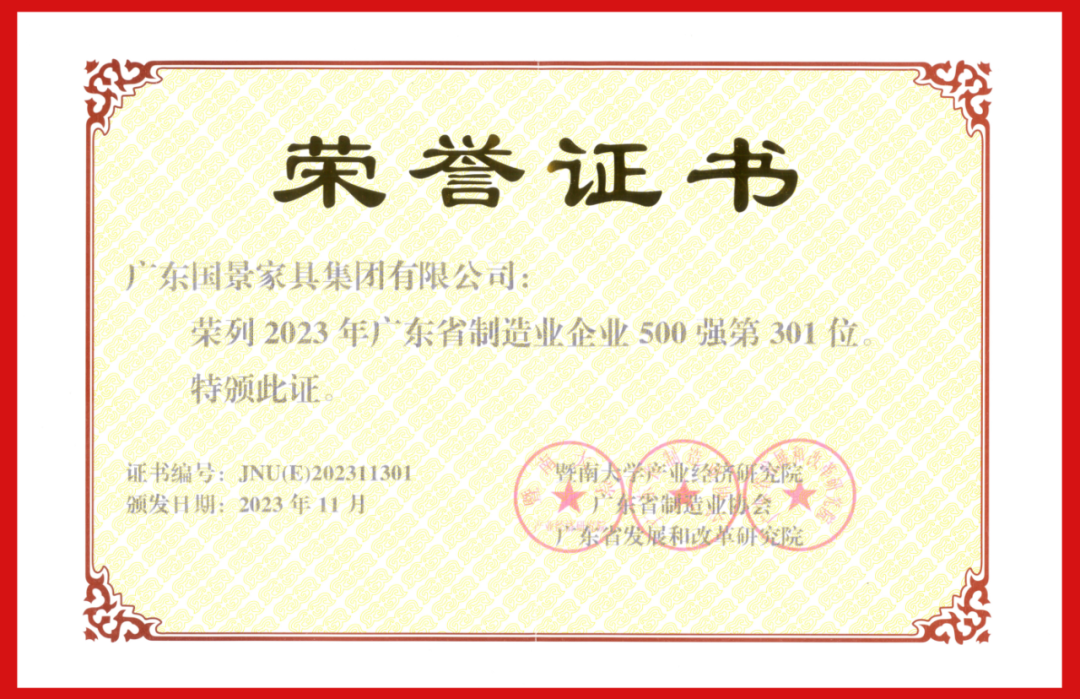 【会员风采】热烈祝贺广东国景家具集团蝉联“2023年广东省制造业企业500强”称号