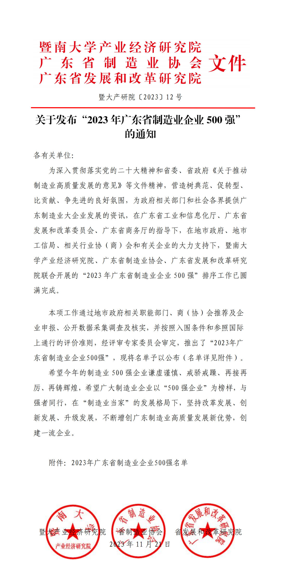 《2023年广东制造业500强企业研究报告》是由广东省制造业协会、广东省发展和改革研究院以及暨南大学产业经济研究院联合发布。广东制造业500强企业代表着全省规模以上制造业的领先水平,它们对整个行业以及产业链的发展起到了积极的带动作用,同时也是广东省制造业和区域经济企稳及持续发展的重要推动力量。