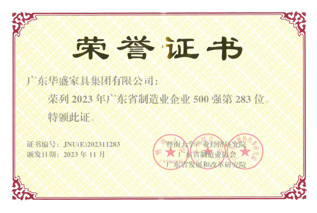 11月21日,由广东省制造业协会、广东省发展和改革研究院及暨南大学产业经济研究院联合主办的2023广东省制造业500强企业峰会在佛山隆重举行。广东省家具协会执行会长单位、华盛家具集团应邀积极参评,并凭借其卓越的企业实力与非凡的业界影响力,再次蝉联“广东省制造业企业500强”榜单!