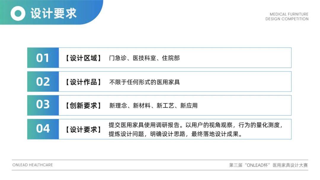 为鼓励专业设计机构和专业人士、高校设计专业师生积极进行医用家具设计创新,促进相关设计成果的转化,促进我国医用家具的设计水平提升,促进我国医院空间环境的改善,助力医用事业发展,广东省家具协会、海太欧林集团联合主办第三届“ONLEAD杯”医用家具设计大赛。