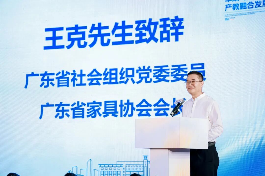 王克会长在题为《产教融合,共同助力华南地区家具产业转型升级》的致辞中就产教融合,共同助力华南地区家具产业转型升级,实现高质量发展提出三点意见:从新形势下家具行业转型升级的发展要求,全面提升职业教育服务经济社会发展能力,产教融合走好家具产业转型升级“最后一公里”,阐述产教融合推动产业转型升级的重要性和迫切性。王会长强调,新时代、新使命、新担当、新作为。我们要认真贯彻党的二十大精神,坚持实体经济为本、制造业当家,以国家发展方向为引领,以家具产业转型升级为目标,科学谋划产教融合的发展道路,全面提升职业教育服务经济社会发展的能力,高效整合联盟内职业院校、协会、企业、园区等各方优势,实现人力资源、设备资源、资金资源、市场资源、技术资源等优质资源的共建共享。对此,我们将与各相关院校、行业协会、企业携手合作,欢迎联盟成员单位积极参与省家协举办的华笔奖系列家具设计大赛、省长杯泛家居专项赛、家居设计展、论坛等设计创新活动,积极推动产教融合工作,为促进我国复合型、应用型、技能型人才培养,促进华南地区智慧家居产业健康发展做出新的贡献!