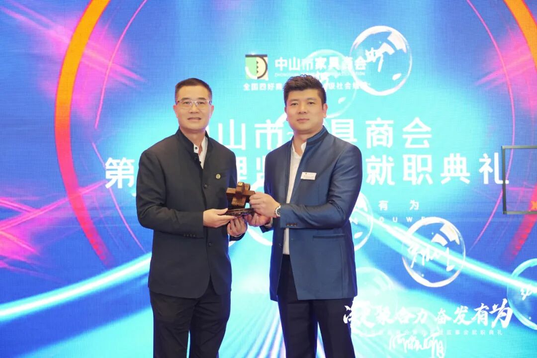 中国家具协会理事长徐祥楠为中山市家具商会第九届理事会会长李剑文颁牌