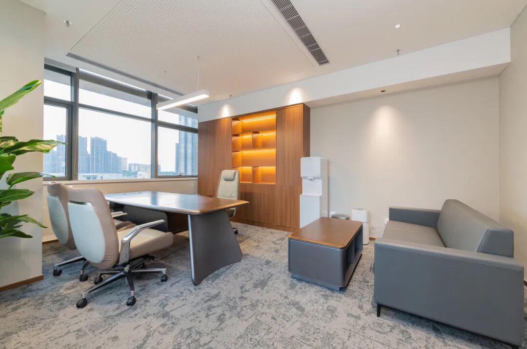 独立办公室的配色方案亦是极简大气。因此,在材质和配色选择上使用了皮革和高级灰调,去塑造一个优雅高端的品质空间。
