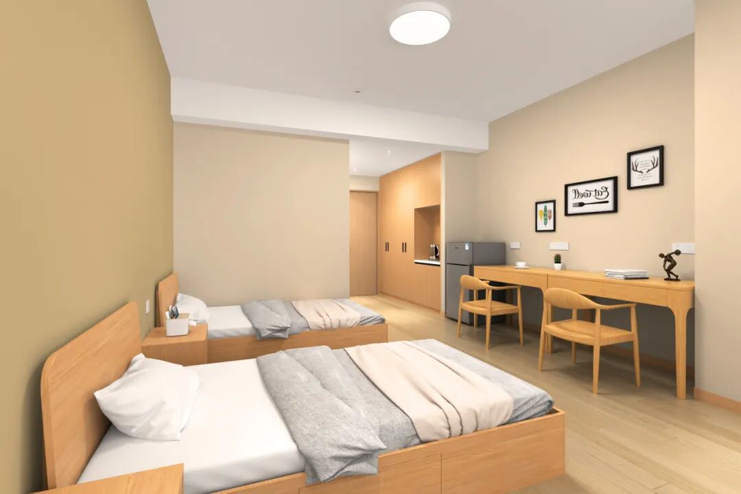 抛开了冗余的装饰堆砌,宿舍套间以简单朴素的软饰和家具组合构建空间层次。
