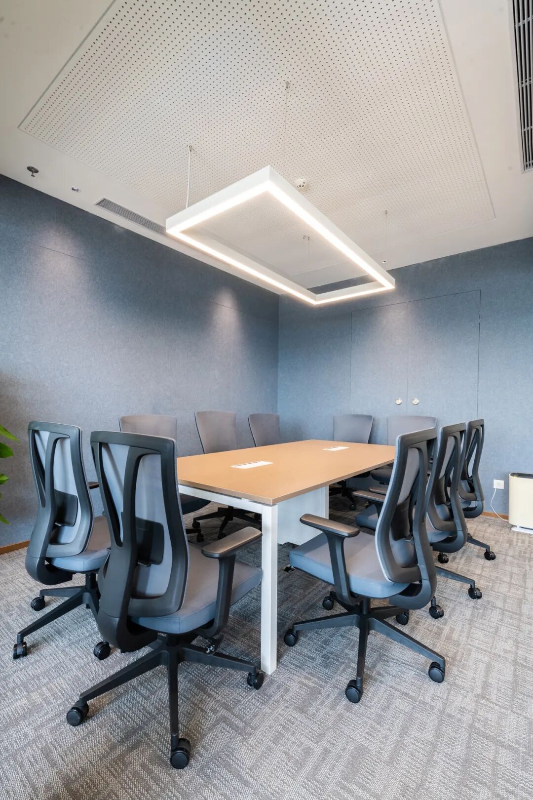 麻灰色的纹理地毯,柔和的木色、深浅有度的棕,它们跳跃着,协调了一般会议空间白色过多而造成的严肃和呆板。