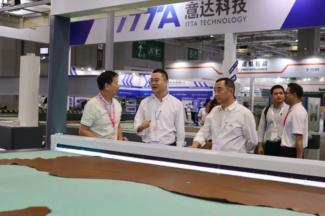 开展首日,广东省家具协会王克会长、张承志秘书长亲自“打卡”意达的展位。在意达科技总经理——罗总的亲自陪同与介绍下,对IC960DHC展现了强烈的兴趣,并对我司深耕真皮裁剪领域二十多年的专业性表示高度的评价与肯定。