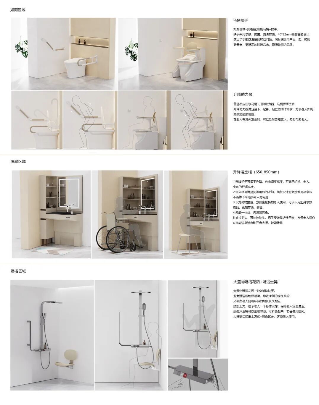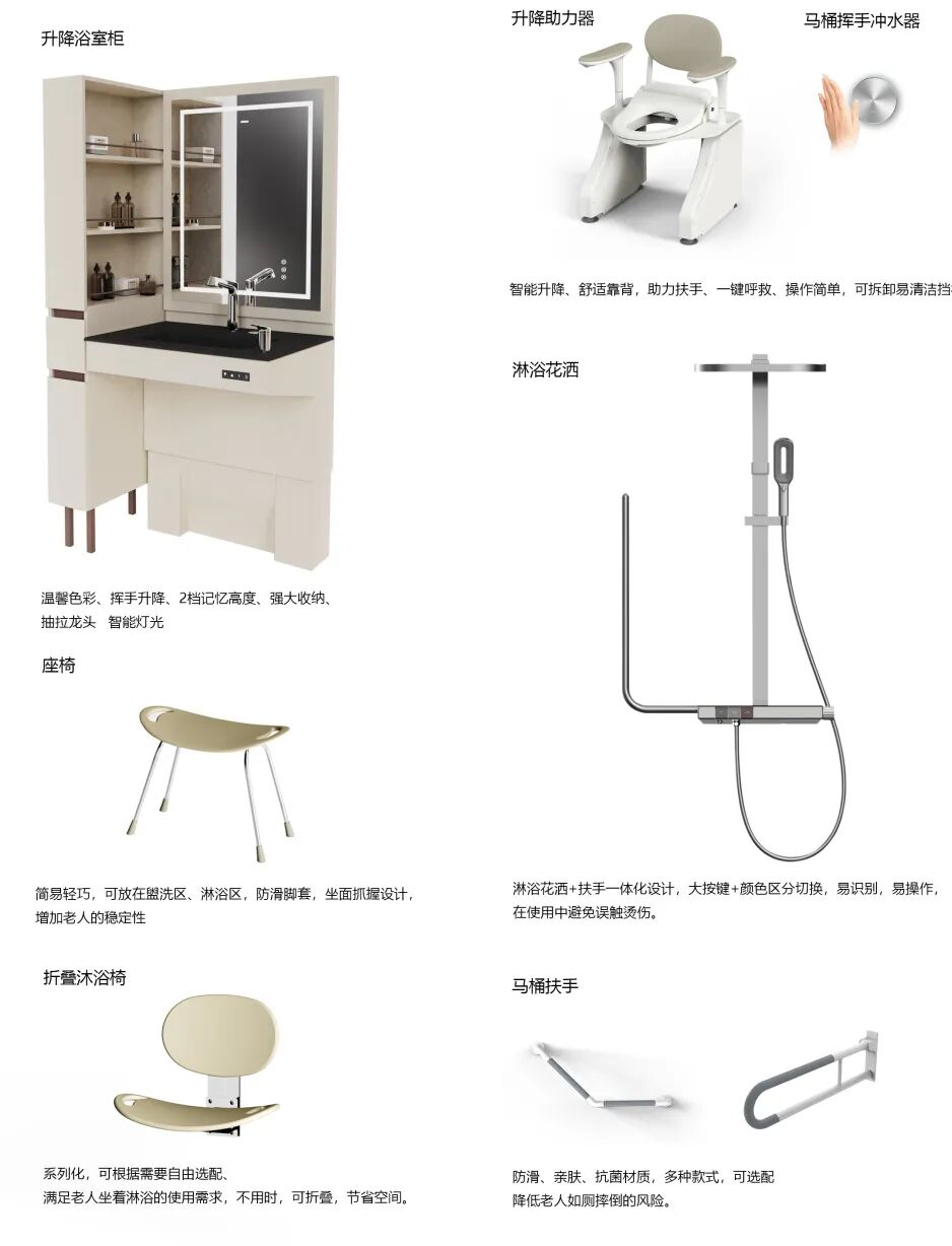 作品描述:卫生间存在诸多安全隐患,40%的人都曾在卫生间摔倒过,安全、易操作是老年人使用浴室空间的关键设计因素,"和玥"无障碍-康养浴室空间旨在为老年人及行动不便的老人提供安全、便利、舒适的浴室空间,增加老年人的操作使用独立性;提升幸福感。满足老人自理自立使用浴室的同时,让老人有健康、尊严的老年生活。以往人们只关注产品的功能性,而忽略了产品与用户的情感互动以及与空间的协调性。该空间在产品功能、情感互动、空间搭配等方面进行了创新设计,各种辅具及地面止滑砖应用,减少浴室安全隐患在安全的前提下,注重老年人和特殊人群的感官享受,色彩运用,让产品、空间不再沉闷,营造温馨舒适的浴室环境产品表面抗菌材料运用,减少细菌滋生,通过无菌+安全的卫生间空间提升老年人的幸福感。