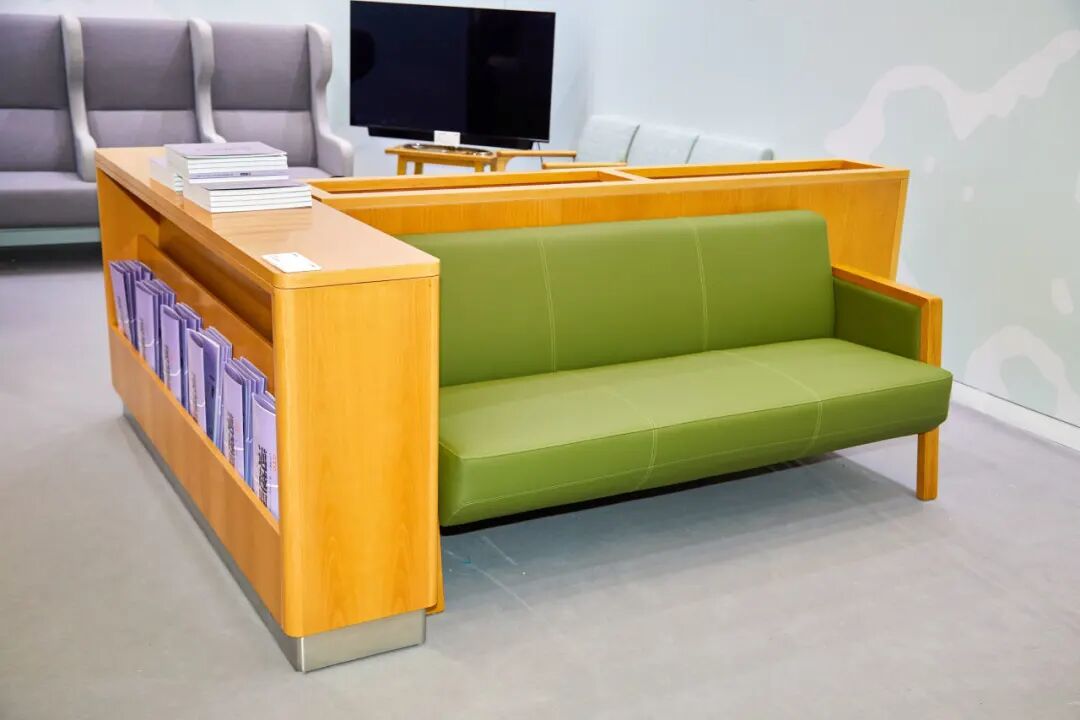 作品描述:中间花槽架在满足装饰作用同时也做阻隔作用。侧边一排杂志展示架。集合了装饰、休息、杂志拜访、花架放置为一体的设计,适合医养空间休闲等候区使用。