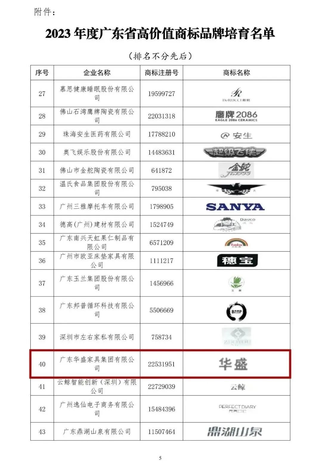 8月18日,广东省商标协会公布了《2023年度广东省高价值商标品牌培育名单》,“华盛”品牌以卓越的产品品质、突出的创新能力、广泛的品牌影响力等多维度实力,成功入选“广东省高价值商标品牌”!“华盛”作为中山本土品牌跻身前列,标志着华盛家具集团在推进商标品牌战略实施、创新商标品牌工作理念的道路上又迈出了坚实一步。