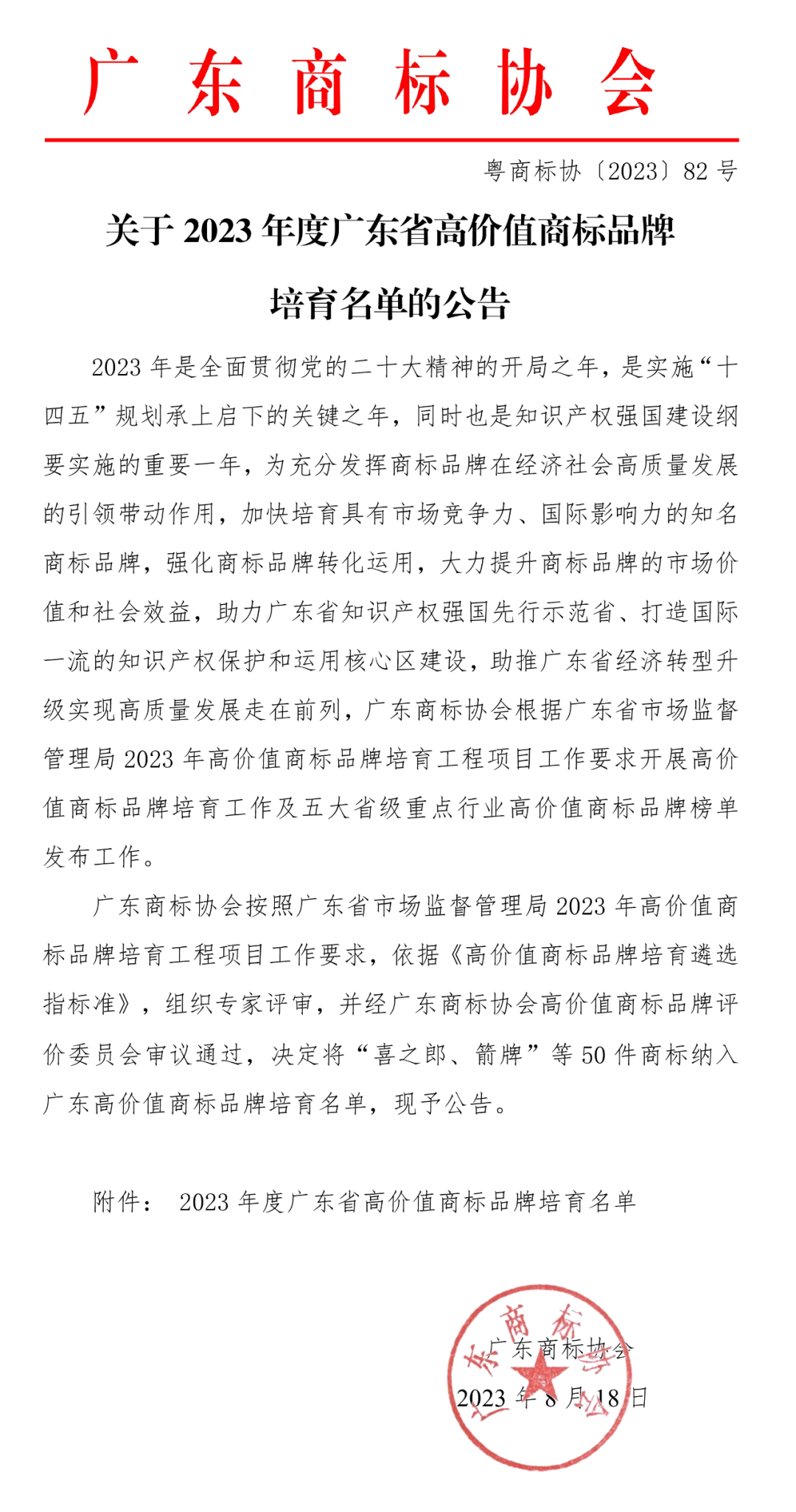 本次《2023年度广东省高价值商标品牌培育名单》是广东商标协会按照广东省市场监督管理局2023年高价值商标品牌培育工程项目工作要求,依据《高价值商标品牌培育遴选指标准》,组织专家评审,并经广东商标协会高价值商标品牌评价委员会审议通过,为充分发挥商标品牌在经济社会高质量发展的引领带动作用,助力广东省知识产权强国先行示范省、打造国际一流的知识产权保护和运用核心区建设,助推广东省经济转型升级实现高质量发展走在前列的一项重要举措。