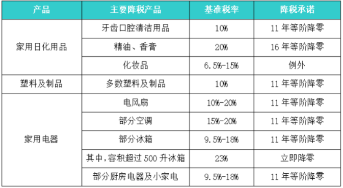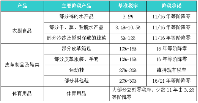 日本是我国第一大轻工产品进口来源地、第三大出口目的地。自日本进口的主要轻工产品为日化用品、塑料制品和家用电器。多数降税产品为11年内等阶降至零关税,有助于逐步降低我国自日本进口轻工产品的成本。对日出口的主要轻工产品中,皮革制品、鞋靴制品基准税率较高且降税年限较长,体育用品大部分税目自协定生效后立即降至零关税。