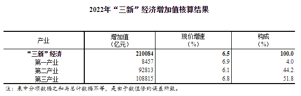 经核算,2022年我国“三新”经济增加值为210084亿元,比上年增长6.5%(未扣除价格因素,下同),比同期国内生产总值(GDP)现价增速高1.2个百分点;相当于GDP的比重为17.36%,比上年提高0.11个百分点。