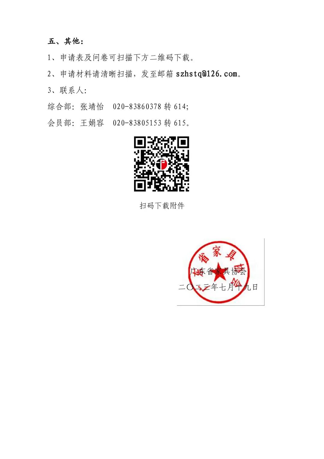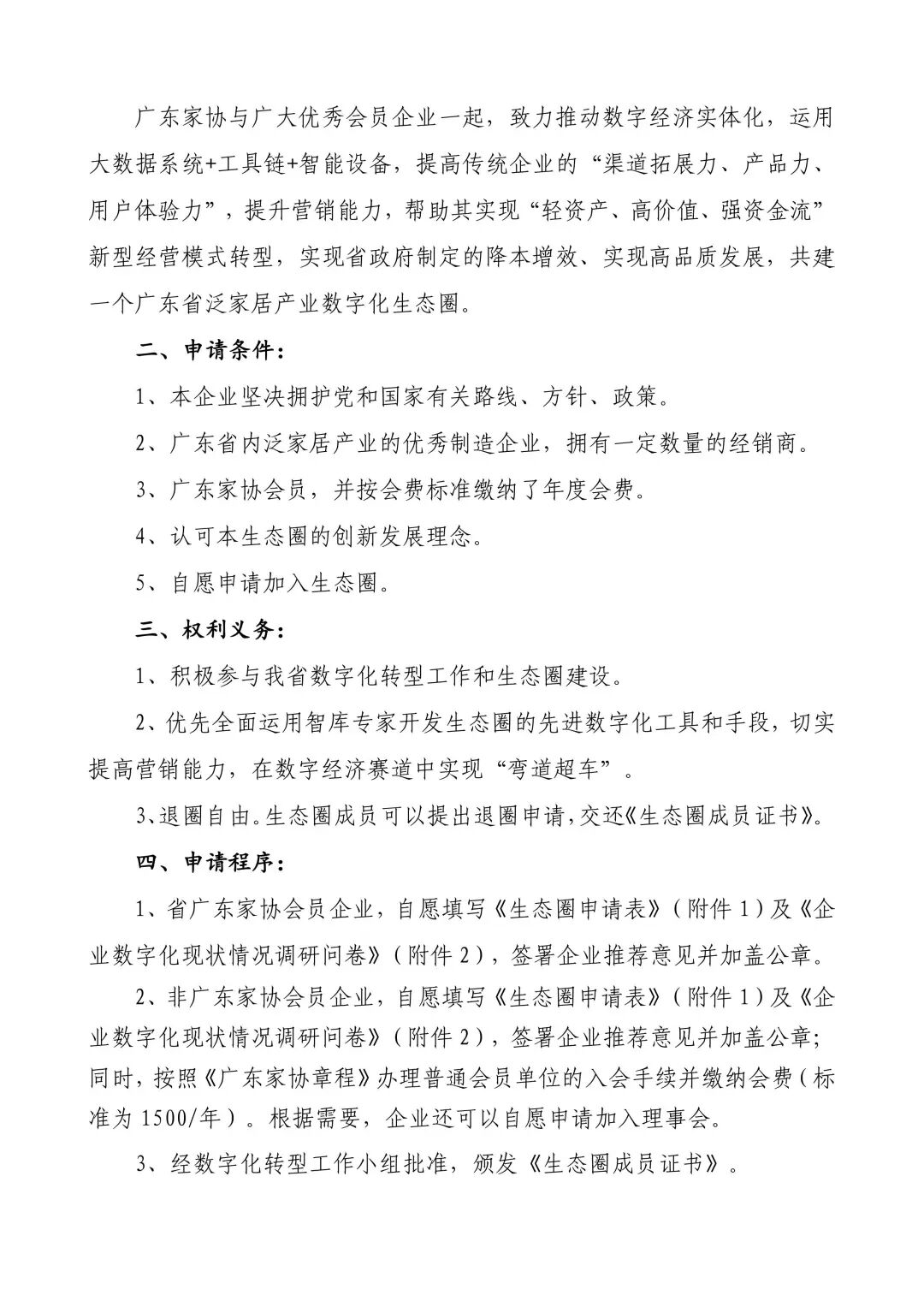 2、非广东家协会员企业,自愿填写《生态圈申请表》(附件1)及《企业数字化现状情况调研问卷》(附件2),签署企业推荐意见并加盖公章;同时,按照《广东家协章程》办理普通会员单位的入会手续并缴纳会费(标准为1500/年)。根据需要,企业还可以自愿申请加入理事会。