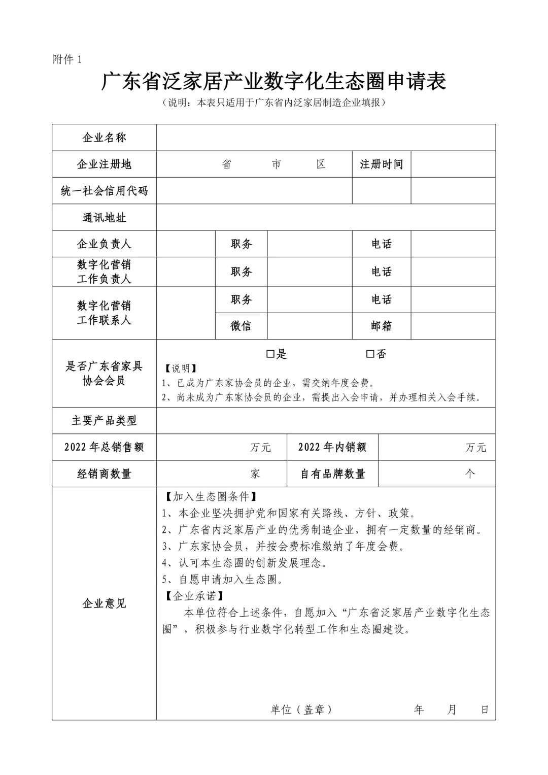 1、广东家协会员企业,自愿填写《生态圈申请表》(附件1)及《企业数字化现状情况调研问卷》(附件2),签署企业推荐意见并加盖公章。