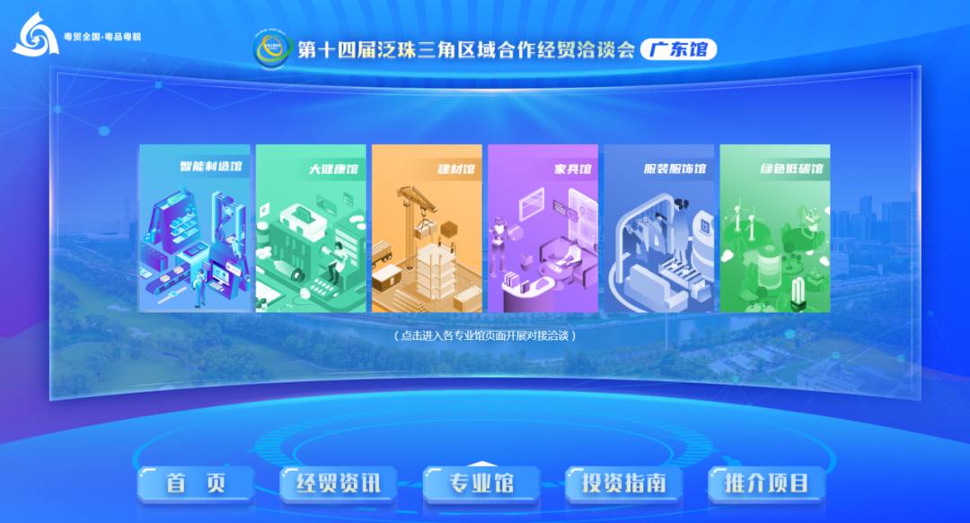 广东分馆围绕“粤贸全国”品牌工程,分别开设了家具、智能制造、大健康、建材、服装服饰、绿色低碳等六大产业专业馆,同时专业馆还举办线上洽谈对接活动,用户可在线点对点开展沟通对接。