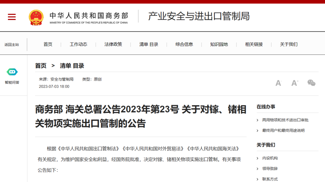 商务部 海关总署公告2023年第23号 关于对镓、锗相关物项实施出口管制的公告
