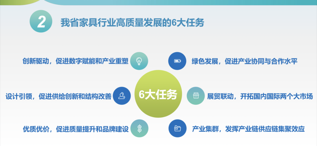 王会长指出,今年省家具协会召开的第十九届广东省家具行业经济工作会议提出,要推动广东省家具行业高质量发展实现新的跨越,必须提振发展信心,坚持实体经济为本、制造业当家,重点开展6大工作任务:创新驱动,促进数字赋能和产业重塑;设计引领,促进供给创新和结构改善;优质优价,促进质量提升和品牌建设;绿色发展,促进产业协同与合作水平;展贸联动,开拓国内国际两个大市场;产业集群,发挥产业链供应链集聚效应。
