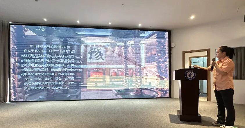 中山市红古轩家具有限公司企划负责人梁丽银向师生们详细介绍了红古轩和华笔奖第十五届“红古轩杯”新中式家具设计大赛的详细内容,期待同学们能了解红古轩,积极参与到“红古轩杯”大赛中来。
