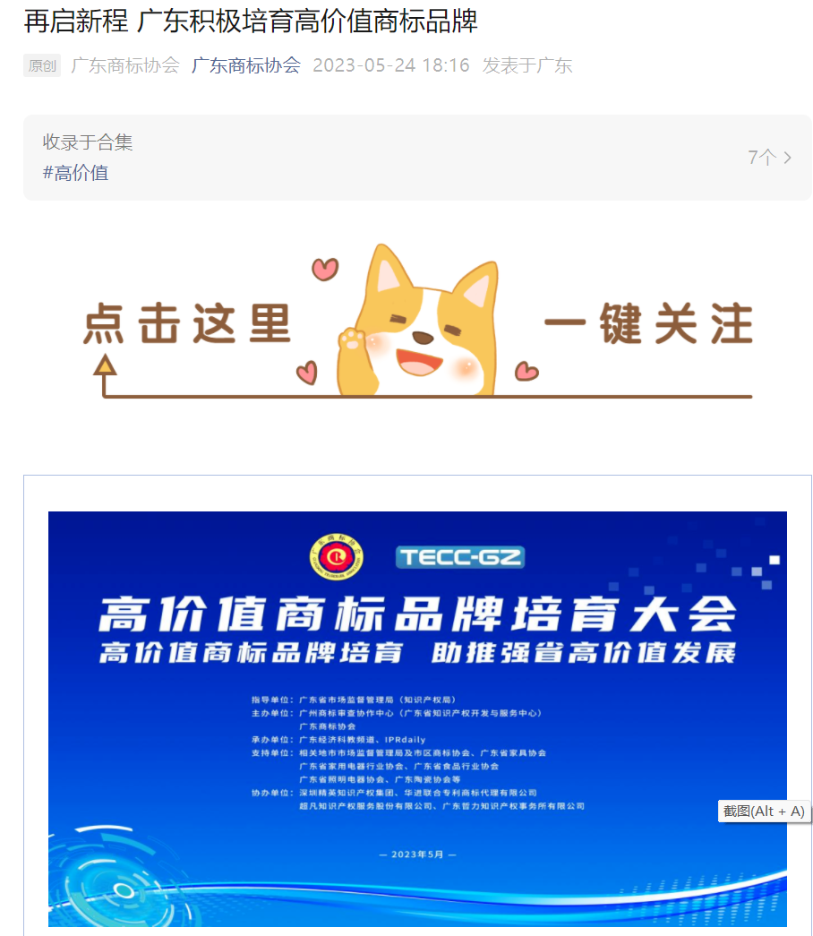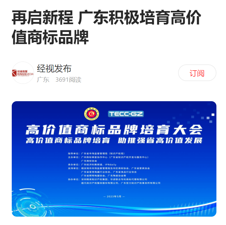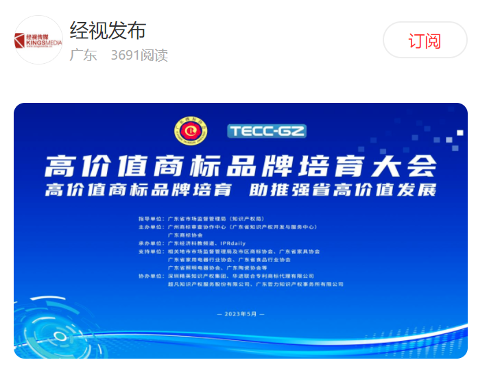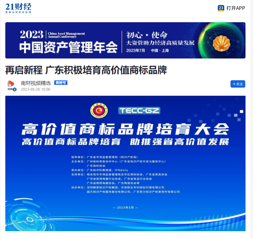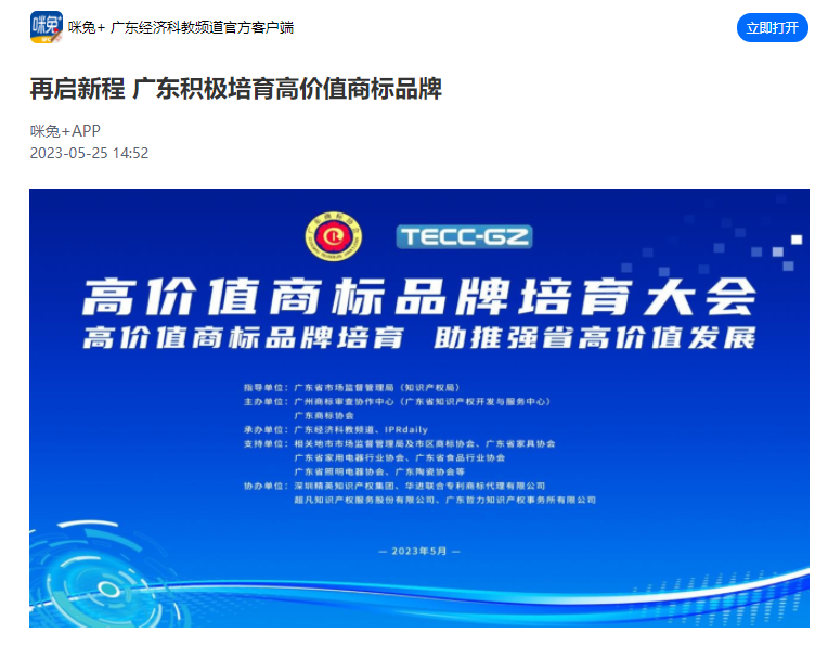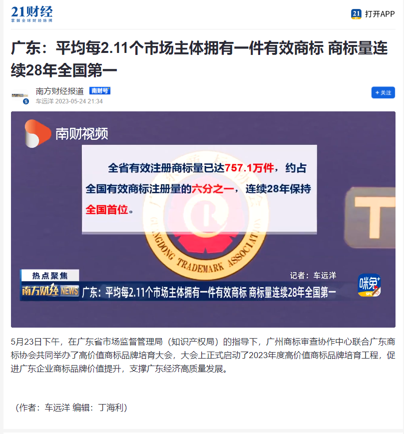 为贯彻落实《广东省知识产权保护和运用十四五规划》工作部署,深化商标品牌战略,大力实施高价值商标品牌培育工程,加快培育具有市场竞争力、国际影响力的知名商标品牌,大力提升商标品牌的市场价值和社会效益,强化商标品牌转化运用,发挥商标品牌特别是高价值商标品牌在经济社会高质量发展的引领带动作用,助推广东产业转型升级实现高质量发展走在前列。5月23日下午,在广东省市场监督管理局(知识产权局)的支持和指导下,广东商标协会与广州商标审查协作中心共同举办了高价值商标品牌培育大会,在广东省及相关地市市场监管局及各行业协会领导的见证下,大会上正式启动2023年度高价值商标品牌培育工程。本次启动大会吸引了众多媒体的关注和报道,反响热烈。