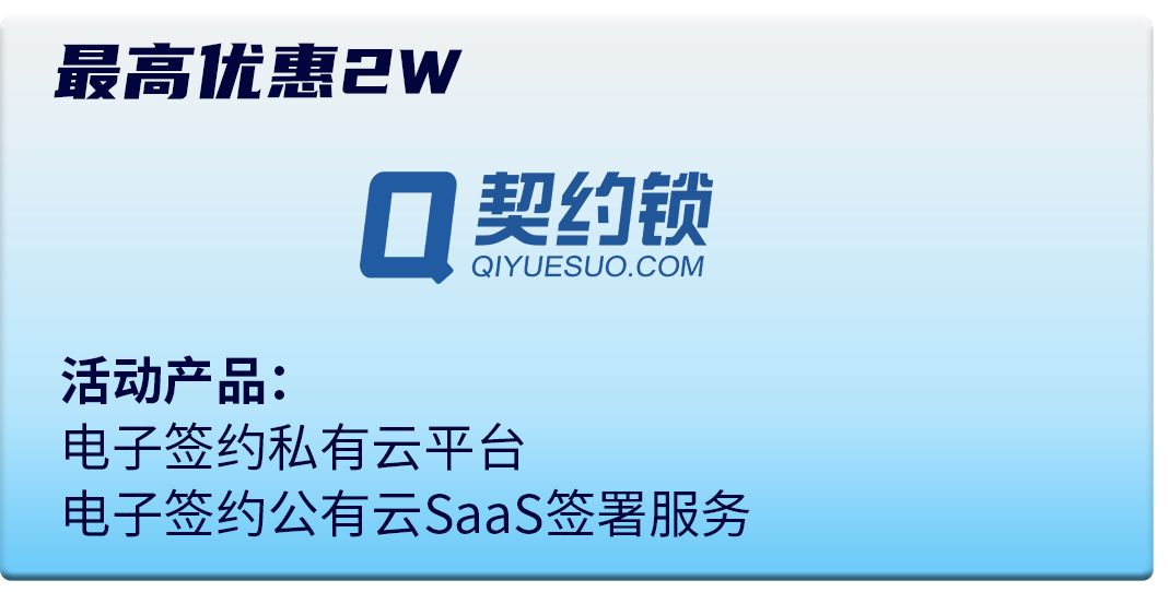 此次【鼎捷智造节】期间购买契约锁电子签约公有云SaaS签署服务则可最高立减1000元!契约锁电子签约私有云平台可享1000、3000、5000、20000元不等抵用券,前100名可获得1份免费的电子合同签署机会!