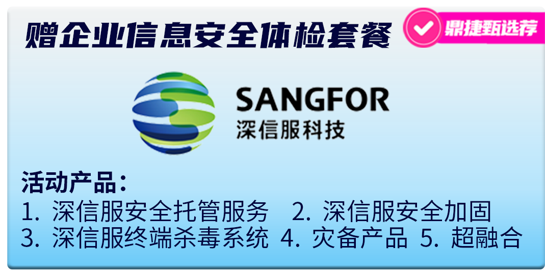 此次【鼎捷智造节】,深信服上架多款王牌产品,包括深信服安全托管服务、深信服安全加固、深信服终端杀毒系统、深信服灾备产品以及超融合,购买上述产品任意一款,均可享受【勒索排查】、【全面威胁检测】、【安全运营中心体验】三大体检套餐。