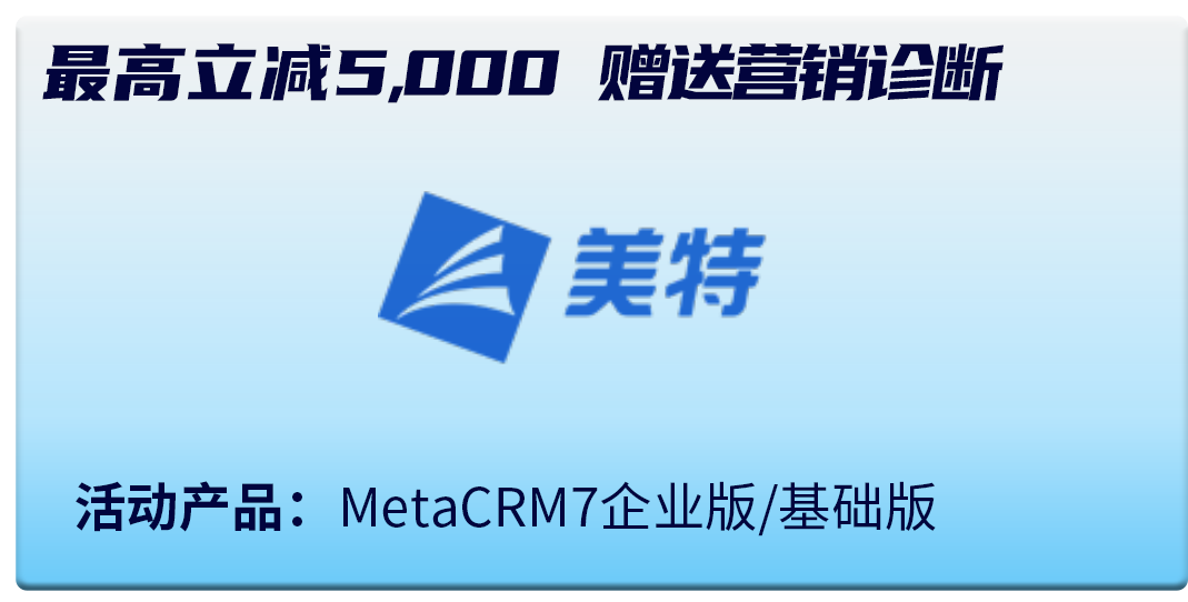 美特软件在此次【鼎捷智造节】期间上线的MetaCRM7企业版、基础版均可享参与大转盘抵用券抽奖,1000元—20000元不等的所有抵扣额度均可试用!购买MetaCRM7企业版还赠送商机营销诊断1次!