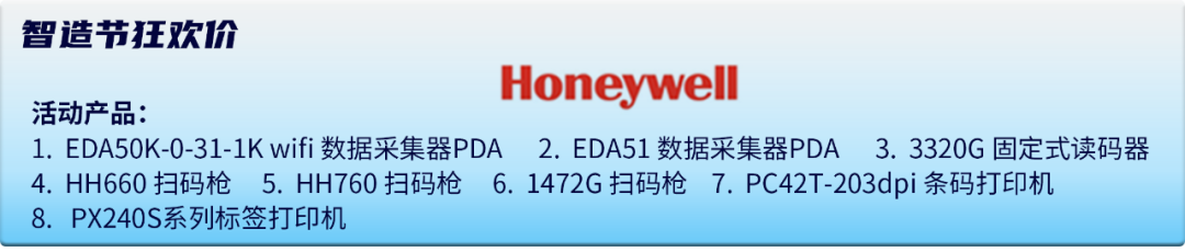 此次【鼎捷智造节】,霍尼韦尔安全与生产力业务集团旗下生产力解决方案和服务部带来了基于条码技术的数据采集和打印设备等王牌产品,包括数据采集器PDA、固定式读码器、扫码枪、条码打印机、标签打印机,可为零售、制造、医疗、仓储物流等行业提供高性能的数据采集产品和服务,所有参加第四届【鼎捷智造节】的产品均享活动特价!