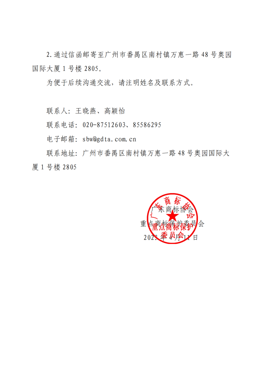 1.通过电子邮件发送至sbw@gdta.com.cn。(请在邮件主题上注明“广东省重点商标保护名录建议”)