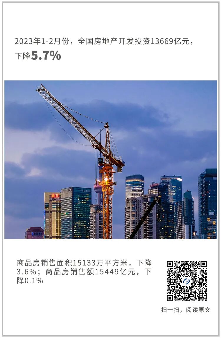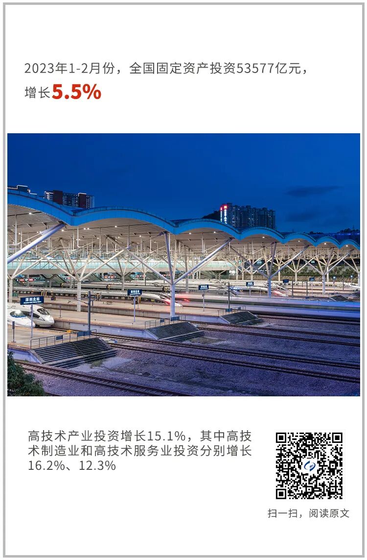 1-2月份,全国固定资产投资(不含农户)53577亿元,同比增长5.5%,比2022年全年加快0.4个百分点;两年平均增长8.8%。分领域看,基础设施投资同比增长9.0%,制造业投资增长8.1%,房地产开发投资下降5.7%。全国商品房销售面积15133万平方米,下降3.6%;商品房销售额15449亿元,下降0.1%。