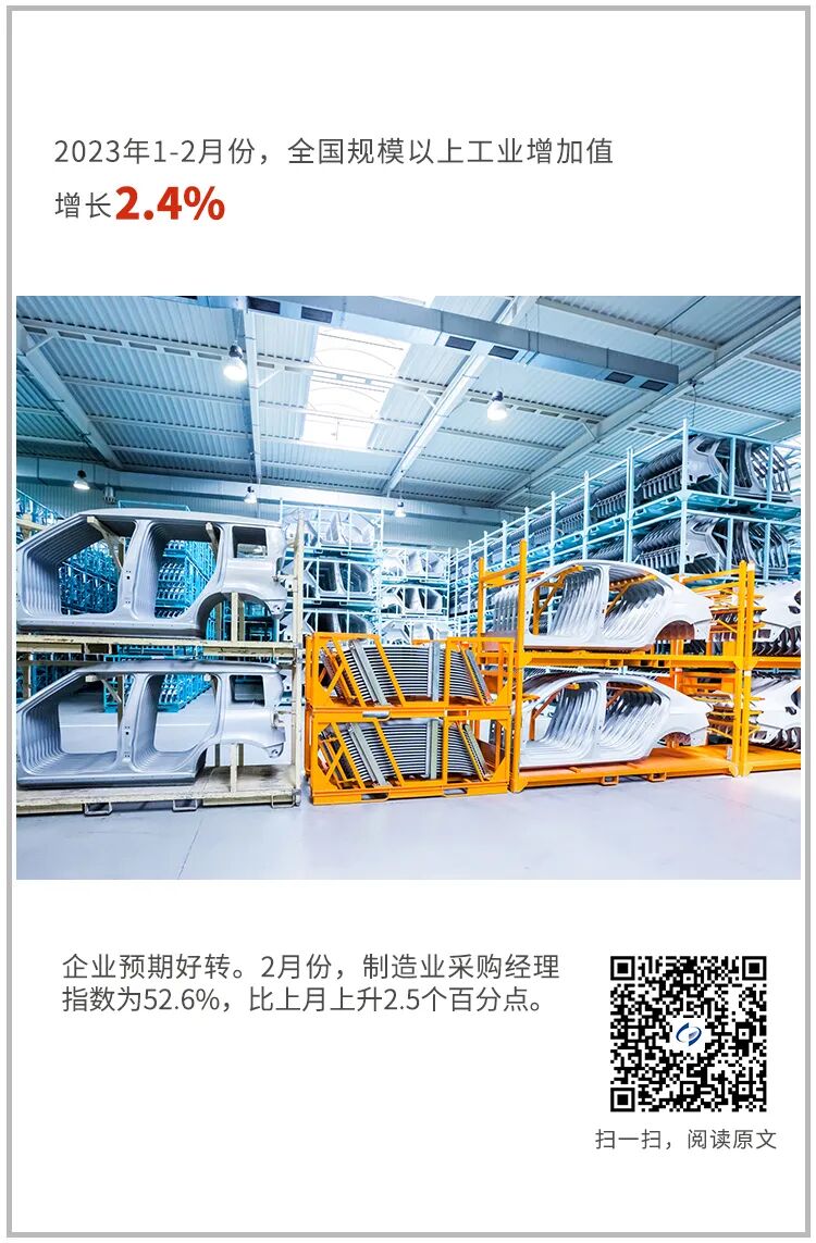 1-2月份,全国规模以上工业增加值同比增长2.4%,比2022年12月份加快1.1个百分点;两年平均增长4.9%。分三大门类看,采矿业增加值同比增长4.7%,制造业增长2.1%,电力、热力、燃气及水生产和供应业增长2.4%。