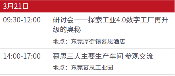 力克将于3月21日,在东莞厚街举办一场主题为“走进慕思——探索工业4.0数字工厂再升级的奥秘”的行业研讨会。届时,行业大咖将现场分享家具行业的现状与发展趋势,一起探索家具企业数字化转型的奥秘。并引领与会嘉宾亲临慕思工业园,参观三大主要生产车间。