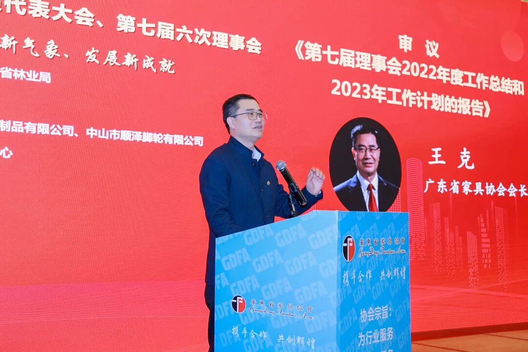 在报告中,王克会长强调,社会组织作为社会主义现代化建设的重要力量,助推广东高质量发展使命在前、重任在肩!作为全省先进社会组织,我们要当好广东高质量发展的坚决贯彻者、坚实推动者、坚定践行者。为此,2023年广东家协主要开展几个方面的工作:协会建设方面,坚持党建引领、高质量发展共识、召开会员代表大会、组织交流学习活动;市场开拓方面,参与主办三个展览、参与“泛珠大会云展厅”宣传活动、参与“粤贸全国”活动、推动中俄林业合作;设计创新方面,办好第十三届广州家居设计展、办好华笔奖系列杯赛、承办第十一届省长杯泛家居专项赛成果展、支持广东省家居设计研发中心建设;产业发展方面,推进我省家具行业数字化转型、推进我省智能家居互联互通、鼓励部分家具企业向粤东西北地区有序转移;行业创新工作,推广分布式光伏项目建设、深入开展我省家具行业品牌建设工作;人才建设方面,促进设计院校毕业生来我省就业、第五届全国家具职业技能竞赛总决赛、职称申报。