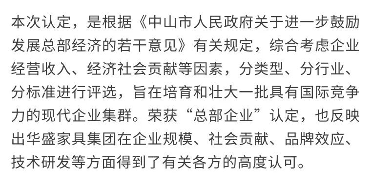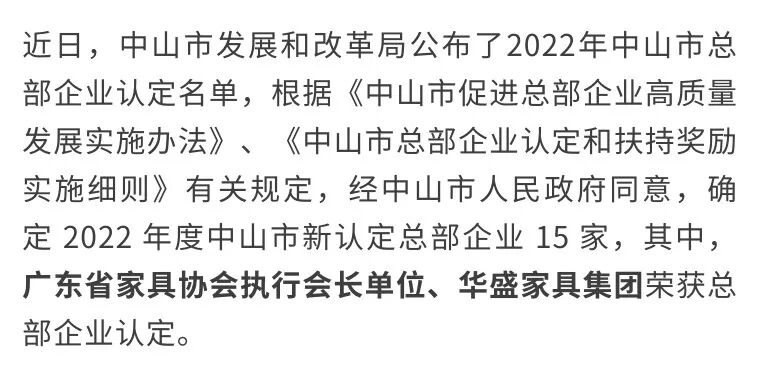 【会长风采】华盛家具集团荣获“2022年中山市总部企业”认定