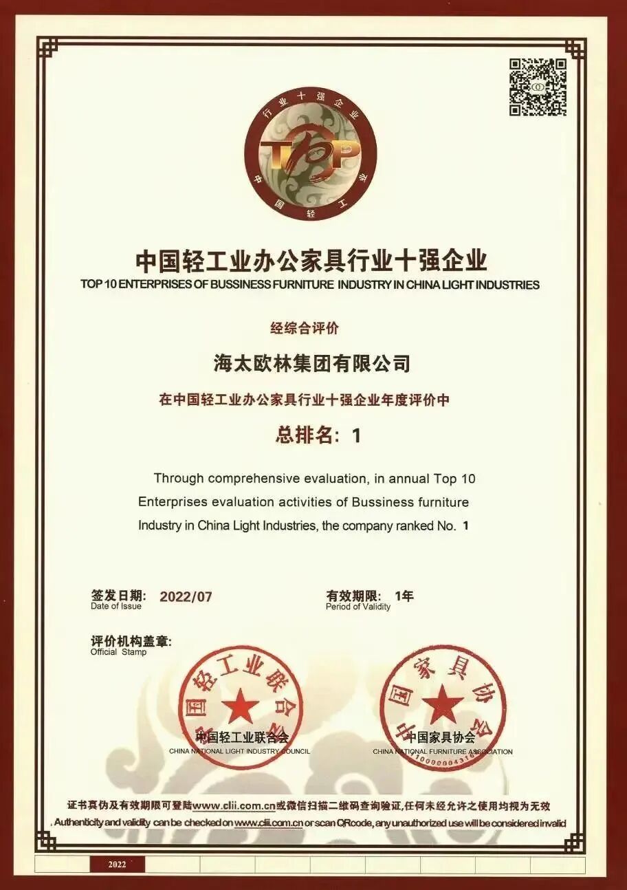 本次摘得中国轻工业办公家具行业十强企业桂冠,源于海太欧林集团坚持走高质量发展道路的一贯追求。在我国轻工业发展迎来历史性战略机遇的当下,海太欧林集团持续深耕商用家具领域,在创新驱动、数字化转型等方面积极探索实践,市场竞争力持续增强。