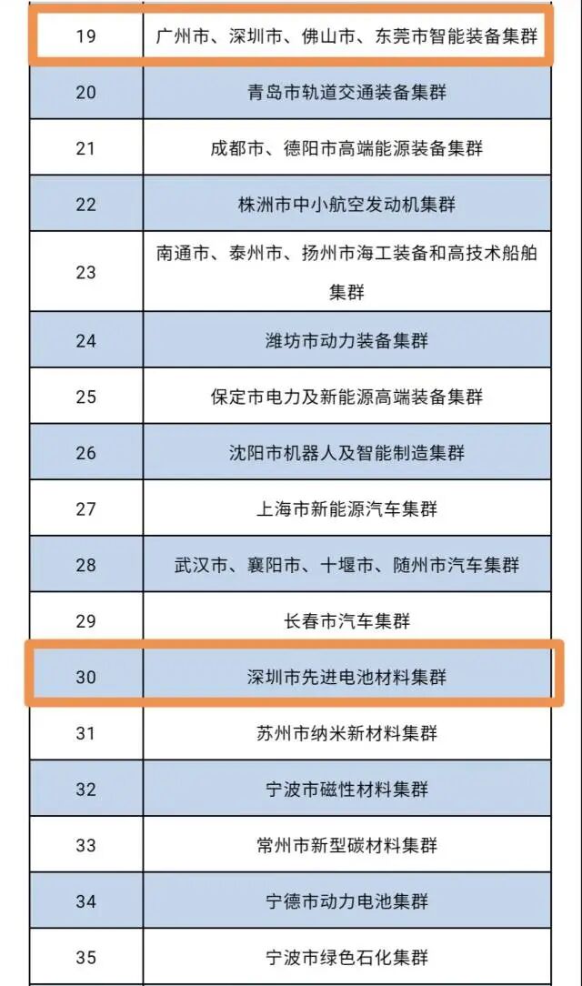 记者梳理统计,广东共有7个集群入围,数量排名全国前列,分别是:深圳市新一代信息通信集群,广州市、佛山市、惠州市超高清视频和智能家电集群,东莞市智能移动终端集群,广州市、深圳市、佛山市、东莞市智能装备集群,深圳市先进电池材料集群,深圳市、广州市高端医疗器械集群,佛山市、东莞市泛家居集群。从地域分布来看,集中在深圳、广州、佛山、东莞、惠州5个珠三角城市。从行业结构来看,这7个集群都是广东近年来培育战略性产业集群的重点。