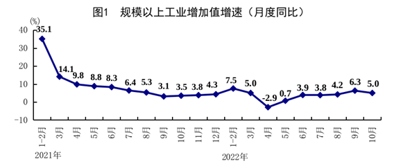 10月份,面对更趋复杂严峻的国际环境和国内疫情新发多发等多重挑战,在以习近平同志为核心的党中央坚强领导下,各地区各部门认真学习贯彻落实党的二十大精神,坚决贯彻落实党中央、国务院决策部署,按照疫情要防住、经济要稳住、发展要安全的要求,高效统筹疫情防控和经济社会发展,加力落实稳经济各项举措,国民经济延续恢复态势,工业投资稳定增长,就业物价总体平稳,新动能积蓄增强,民生保障有力有效,经济社会大局稳定。