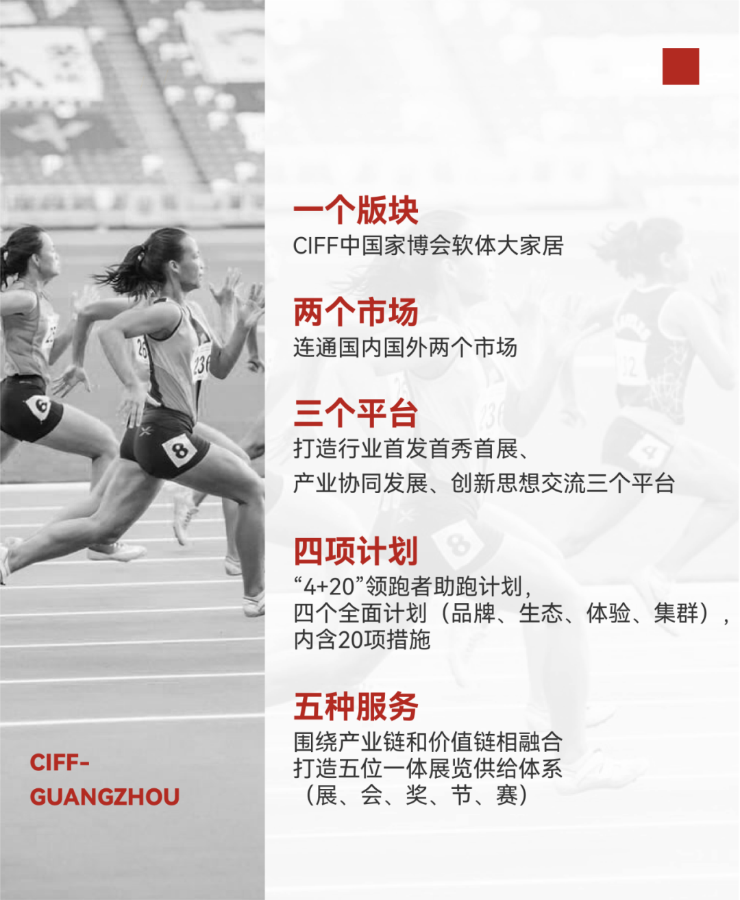 GIVE ME FIVE!大力进军国内市场。广交会展馆A区1.2-5.2号馆面向国内消费市场,打造大软体内销板块。中国家博会(广州)将充分发挥展店联盟赋能优势,从促进B2B的商贸合作,到拉近to C的生活方式交流。Trinity!广交会展馆B区继续擦亮外贸金字招牌,同时以供需精准对接连通国内国际两个市场。9.2-11.2三个馆打造软体生活馆,集中沙发、床垫、软床、床上用品等优质制造商,向国际市场及国内产业B端全面展示中国沙发、睡眠工厂的制造实力,促进制造端与品牌端、消费端的精准对接,促进内外贸一体化发展。中国家博会(广州)将携手行业共商共建共享,齐聚软体大家居产业领跑者,在向上高质量发展的双循环道路上齐头并进。期待明年三月,与行业各方共聚羊城,举手相庆!